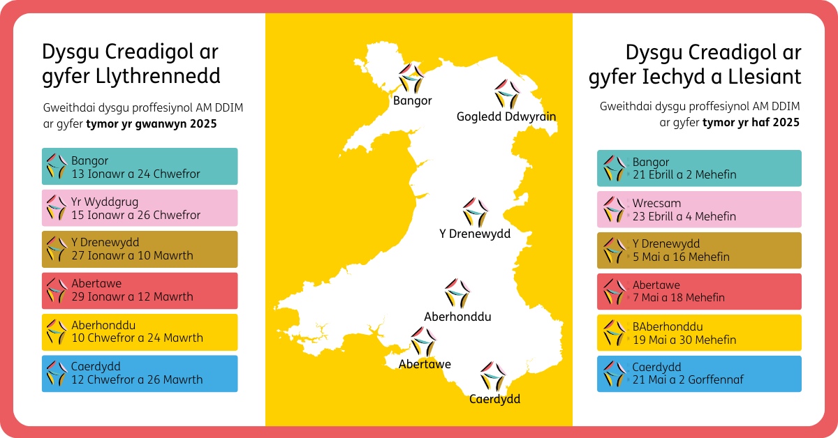 Trwy ymarferion ymarferol, astudiaethau achos a myfyrio, mae Archwilio yn eich gwahodd i gamu y tu hwnt i'r cyffredin, rhoi cynnig ar ddulliau addysgu ffres a chreadigol. P'un a ydych chi'n newydd i ddysgu creadigol neu'n barod i ddyfnhau eich ymarfer, bydd Archwilio yn sbarduno syniadau y gallwch eu dwyn yn ôl i'ch ystafell ddosbarth ar unwaith. Byddwch yn gadael yn llawn egni, yn llawn cymhelliant ac yn fwy parod i gefnogi anghenion amrywiol eich dysgwyr gyda hyder a chreadigrwydd.